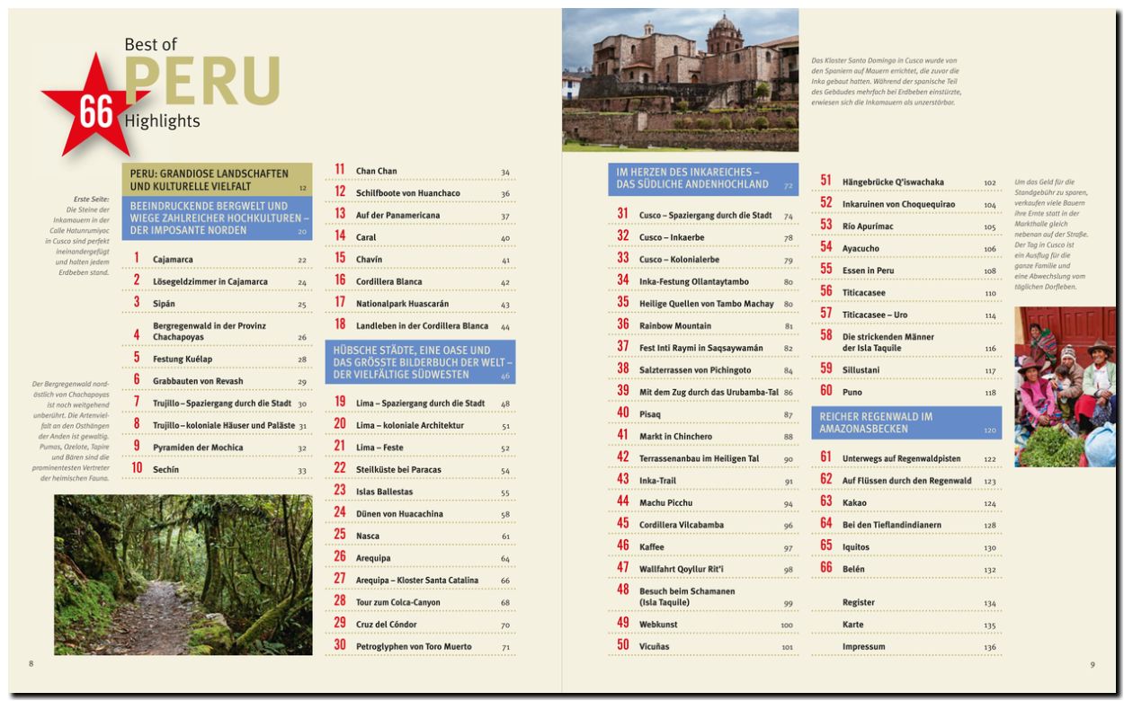 „Best of Peru“ stellt von diesem facettenreichen Land die 66 lohnenswertesten Reiseziele vom Norden bis ins Amazonastiefland vor. Fehlen dürfen dabei nicht die Ruinen von Machu Picchu, die Städte Trujillo und Cusco oder verschiedene Aspekte des Titicacasees. Das Buch nimmt aber auch mit auf die spannende Reise mit dem Zug durch das Urubamba-Tal, zu den strickenden Männern der Isla Taquile oder zu dem Landleben in der Cordillera Blanca.