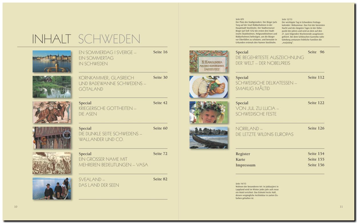 Schweden in seiner landschaftlichen Vielfalt wird mit über 270 Bildern ausführlich vorgestellt. Sechs Specials berichten von den lebhaften Festen der Schweden, über die alten Götter des Nordens, die berühmteste Auszeichnung der Welt, den Nobelpreis, das schmackhafte schwedische Essen, den Namen "Vasa" und über die erfolgreiche schwedische Krimiliteratur.