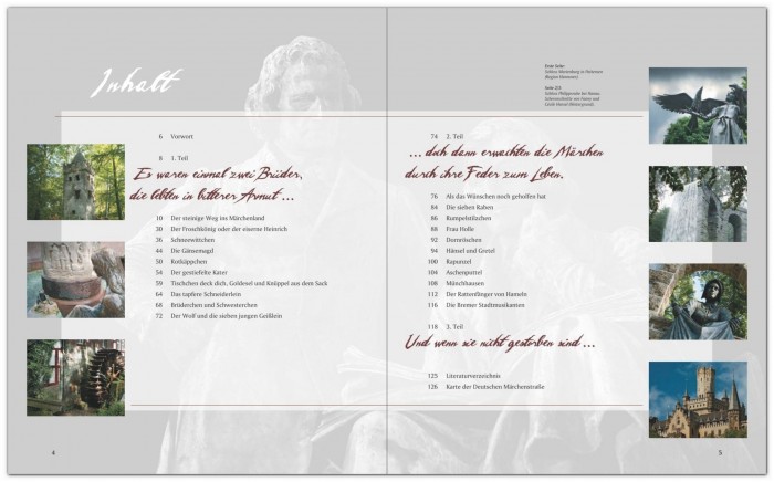 Dieser Bildband zeigt die Orte an der Märchenstraße und gibt Einblicke in verwunschene Schlösser und geheimnisumwitterte Burgen abseits der Hauptroute. Der Begleittext schildert die bekanntesten Märchen und ihre Hintergründe: Bremer Stadtmusikanten – Schneewittchen – Brüderchen und Schwesterchen – Rapunzel – Hänsel und Gretel – Der Froschkönig – Frau Holle – Rumpelstilzchen – Der Mond – Dornröschen – Die Gänsemagd – Tischlein deck dich – Rotkäppchen – Der gestiefelte Kater – Das tapfere Schneiderlein – Aschenputtel – Der Wolf und die sieben Geißlein – Die sieben Raben – Der Rattenfänger von Hameln.