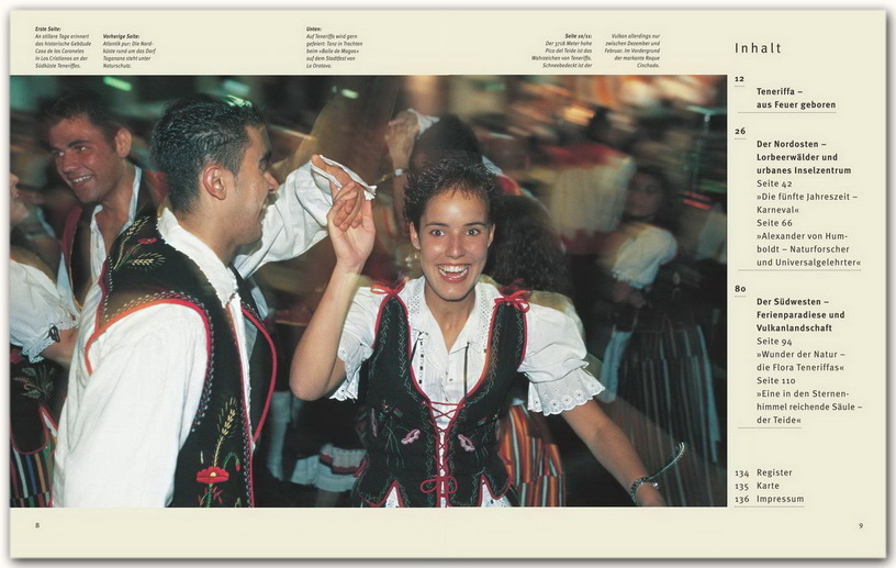 "Viele der Fotografien erstrecken sich über zwei volle Seiten, so dass besonders weitwinklige Landschaftsaufnahmen optimal zur Geltung kommen. Jede Seite überrascht durch ein anderes, ansprechendes Design. Die Fotografien haben wunderschöne Farben und zeichnen sich durch viel Lebendigkeit aus, da oft Situationen und besondere Momente eingefangen wurden. Dies macht den Bildband zu einer stimmungsvollen und abwechslungsreichen Lektüre. Es wurde Wert darauf gelegt, die Bilder nicht nachträglich zu bearbeiten. Die Zusammenstellung der Bilder ist weder eintönig noch wird von einem zum nächsten Thema gesprungen. So versinkt der Betrachter auf der einen Doppelseite in wunderschönen Landschaften und Panoramen, um auf der nächsten Seite die städtische Vielfalt und das bunte Treiben auf Festen und Märkten zu bewundern. Die erläuternden Texte von Ralf Nestmayer am Anfang der Kapitel lockern den Bildband auf und bringen dem Betrachter die Insel näher. Sie sind eine wunderbare Ergänzung zu den Fotografien. Die 'Reise durch Teneriffa' macht ihrem Namen alle Ehre: Der Betrachter begibt sich beim Blättern durch das Werk wirklich auf eine Reise durch die paradiesische Insel, auf der die Vielfalt des Eilandes entdeckt werden kann."