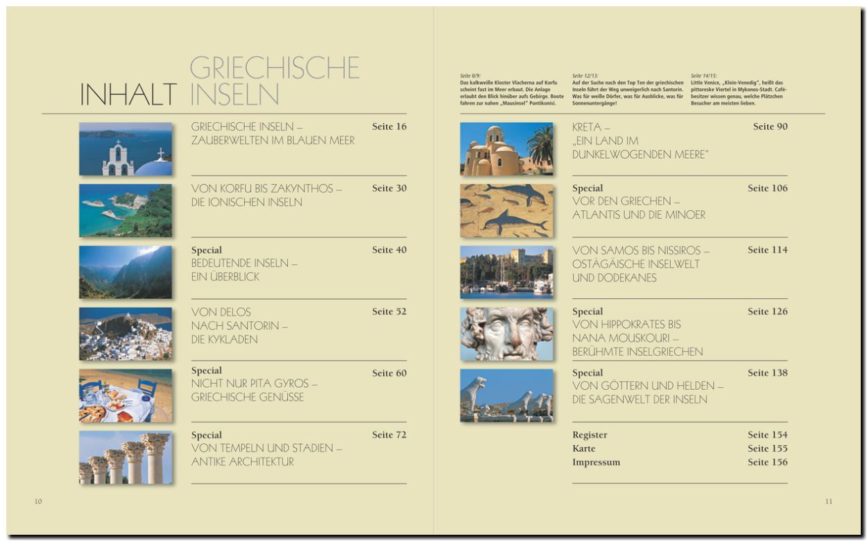 Über 280 Bilder zeigen die griechischen Inseln in ihrer ganzen Vielfalt, vier Specials berichten über die griechische Küche, die antike Götter- und Sagenwelt, Kulturen aus einer fernen Vergangenheit und die Inseln von A bis Z.