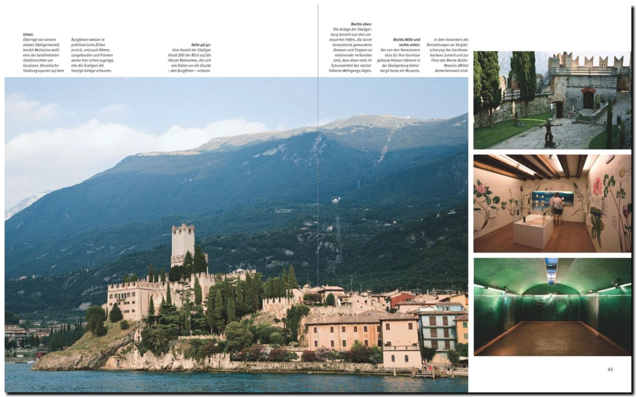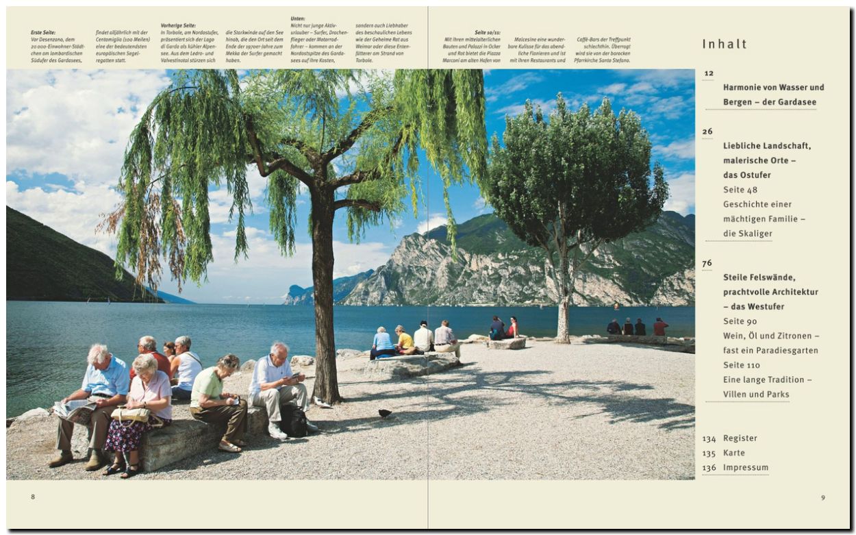 Über 180 Bilder zeigen den Gardasee in all seinen Facetten, vier Specials berichten unter anderem über Wein und Oliven sowie das Geschlecht der Skaliger,die seit ihrer Herrschaft im 13. und 14. Jahrhundert das Erscheinungsbild Oberitaliens mit ihren eindrucksvollen Bauwerken rund um den Gardasee bis in die Gegenwart prägen.