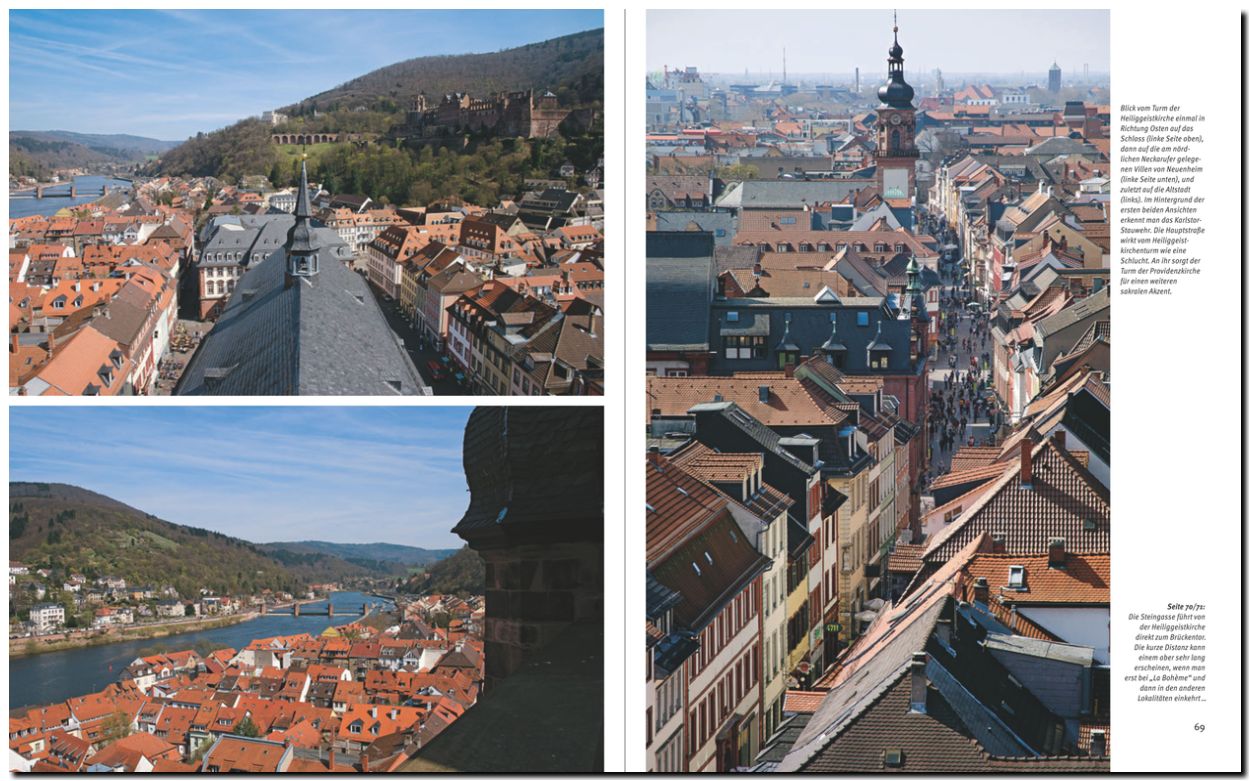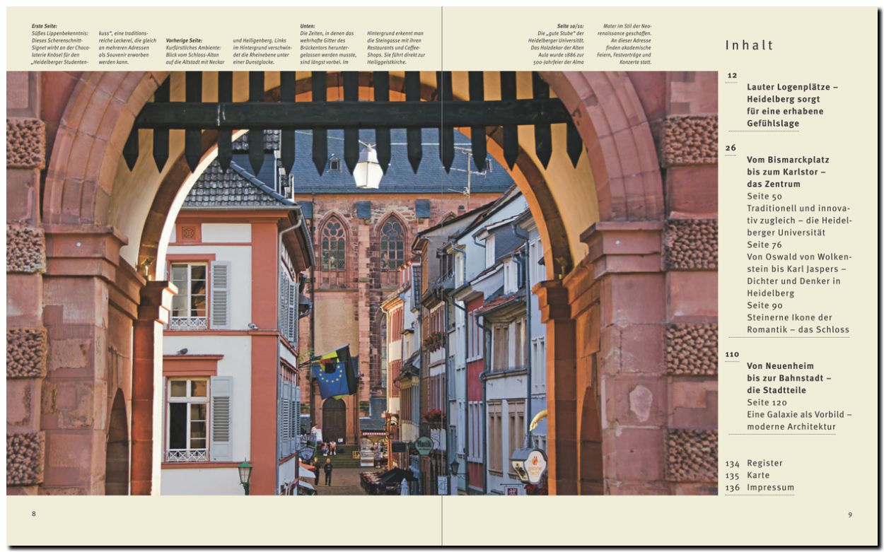 Rund 170 Bilder zeigen Heidelberg in seiner ganzen Vielfalt. Vier Specials berichten über die altehrwürdige Universität, die romantische Schlossruine, über Dichter und Denker in und über Heidelberg und moderne Architektur, die überraschende Akzente setzt.