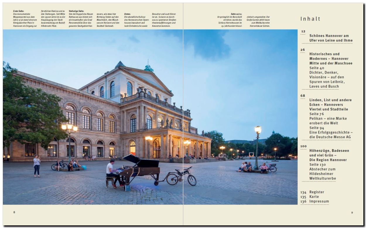 Über 200 Bilder zeigen die Leinemetropole in allen Facetten und führen durch die vielseitige und reizvolle Umgebung zwischen Steinhuder Meer, Deister und Marienburg. Specials beschäftigen sich mit den Besonderheiten der Stadt, wie der Pelikan-Fabrik, der modernen Architektur oder der Deutschen Messe.