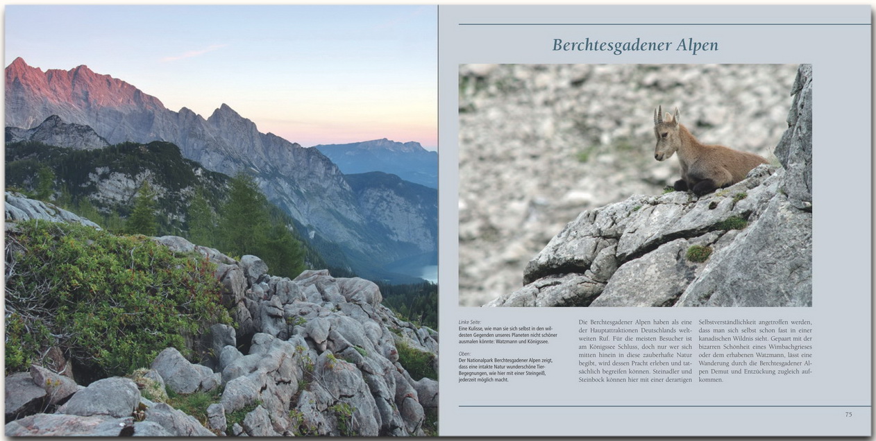 Nicht weniger eindrucksvoll ist das facettenreiche Gebirge der Ammergauer Alpen oder das Wettersteingebirge mit Deutschlands höchstem Berg, der Zugspitze. Weniger dramatisch und dennoch wunderschön lockt das Karwendel mit abgeschiedenen Gipfeln und traumhaften Tälern und auch das Estergebirge ist ein eher unbekanntes Juwel. Bei einer Tour durch die zauberhafte Natur der Berchtesgadener Alpen trifft man leicht auf Gämsen und Steinadler. Gepaart mit der bizarren Schönheit eines Wimbachgrießes oder dem erhabenen Watzmann, lässt eine Wanderung durch diese Region Demut und Entzückung zugleich aufkommen.