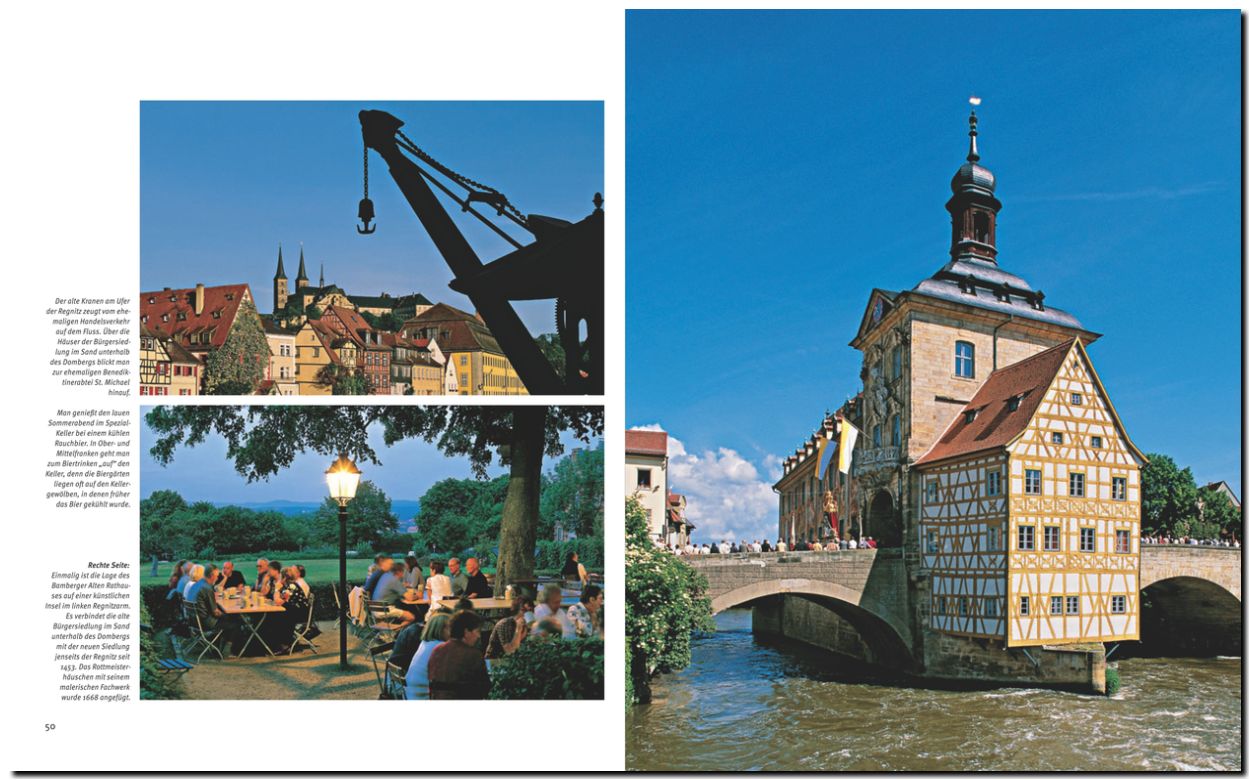 „Franken ist ein gesegnetes Land“, stellte schon Johann Wolfgang von Goethe fest und lässt das Schloss der Maria im „Götz von Berlichingen“ am Ufer des Mains liegen. Der wichtigste fränkische Fluss spielt auf seinem Weg von Ost nach West geradezu mit der Landschaft, bildet Schlingen und Schleifen, fließt zu Beginn durch das mächtige Fichtelgebirge, trennt Steigerwald und Haßberge, bis er schließlich den Spessart durchquert. Dabei verbindet der Main eine Kulturlandschaft, die Perlen ohnegleichen bietet: alte Städte wie Bayreuth, Bamberg, Würzburg und Aschaffenburg, mauerumringte mittelalterliche Orte wie Dettelbach und Sulzfeld, Burgen und Schlösser wie die Plassenburg Kulmbachs oder die weltberühmte Residenz von Würzburg, bedeutende Klöster und Kirchen wie Banz und Vierzehnheiligen.