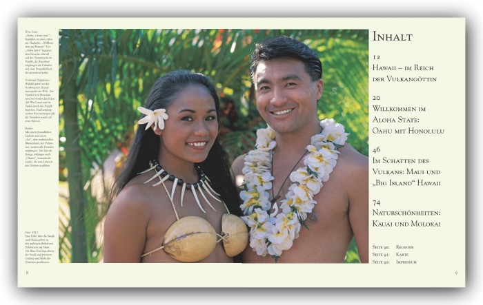 Traumhafte Sandstrände mit rauschenden Palmen samt in der Sonne glitzerndem Meer, spektakuläre Steilküsten und schwarze Lavaklippen – nicht nur an den Küsten seiner Inseln präsentiert sich Hawaii wie im Bilderbuch. Wilde Berglandschaften mit gewaltigen Vulkankegeln, tropische Urwälder mit romantischen Wasserfällen, tiefgrüne Wälder und fruchtbare Täler tragen zu der Vielfalt des Archipels bei. Mit einem freundlichen Lächeln und dem traditionellen Blumenkranz werden Besucher willkommen geheißen, die sich dem „Aloha-Spirit“ kaum entziehen können.