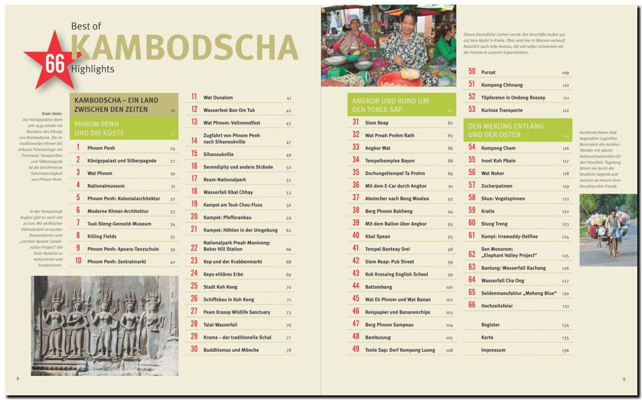 „Best of Kambodscha“ stellt die 66 lohnenswertesten Reiseziele vor. Dabei dürfen Sehenswürdigkeiten wie das UNESCO-Welterbe Angkor Wat, das buddhistische Kloster Ta Prohm und der Bayon-Tempel in der Stadt Angkor Thom ebenso wenig fehlen wie der Besuch einer Seidenweberei und der Streifzug durch einen der bunten Märkte von Phnom Penh. Vergessen wird dabei nicht, einen Blick in Kambodschas jüngste Vergangenheit zu werfen, die über die große Geschichte des Landes einen Schatten wirft.