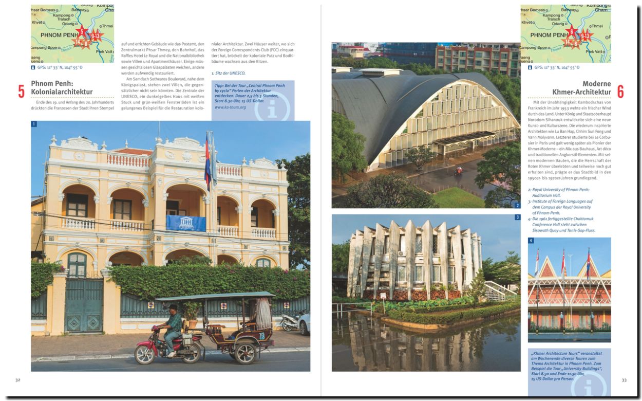 In über 195 faszinierenden Fotos werden die Facetten eines geschichtsträchtigen Landes gezeigt, von der verschlafenen Kolonialstadt Battambang im Nordwesten bis zu den traumhaften schönen Sandstränden und Küstenstreifen am Golf von Thailand. Von der lebendigen Millionen-Metropole Phnom Penh bis zu den stillen Fischerdörfern am Mekong.