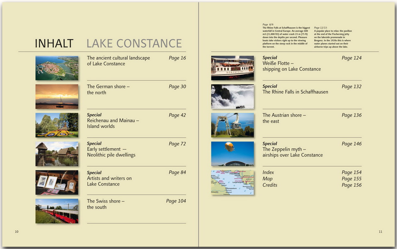 Rund 260 Bilder zeigen den Bodensee und seine Umgebung am deutschen Ufer, in Vorarlberg und der Ostschweiz in allen Facetten. Sechs Specials berichten unter anderem über die Klosterinsel Reichenau, die zum UNESCO-Welterbe zählt, und die kulinarischen Entdeckungen, die man auf einer Reise durch die Region machen kann.