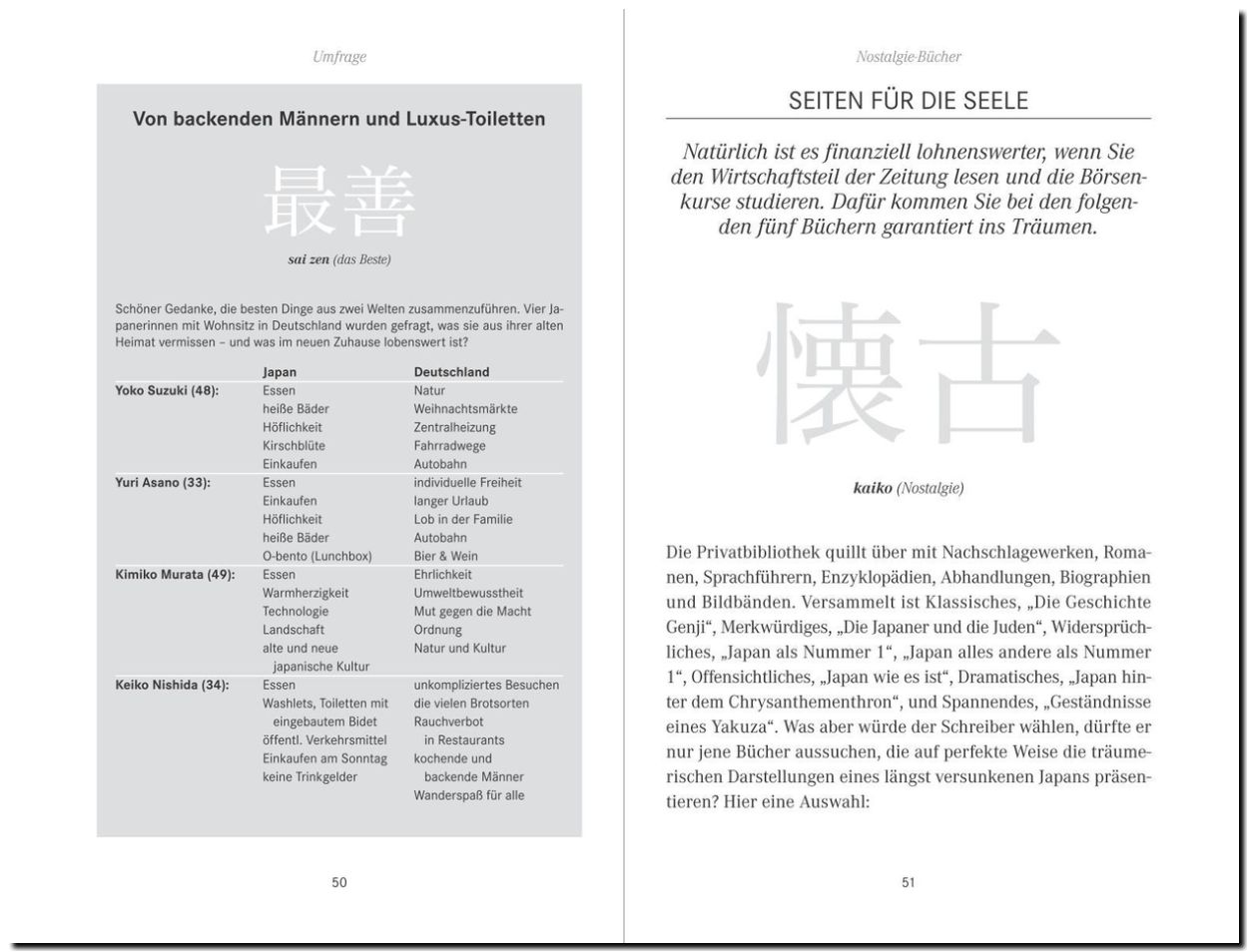 "Durch den patchworkartigen Aufbau des Buches entsteht ein Bild von Japan, Stück für Stück im Kopf des Lesers. Ein wenig so, als würde man selber im Land reisen und sich seine Gedanken über das Gesehene machen. Krüger ist dabei der kundige Reiseleiter, der dezent erklärt, ohne aufdringlich oder mit erhobenem Zeigefinger belehrend zu sein. Seine Geschichten sind dadurch sowohl für Japankenner wie für Einsteiger sehr interessant und verführen, trotz (oder gerade wegen?) ihrer manchmal fast anekdotenhaften Kürze, zum Weiterlesen."