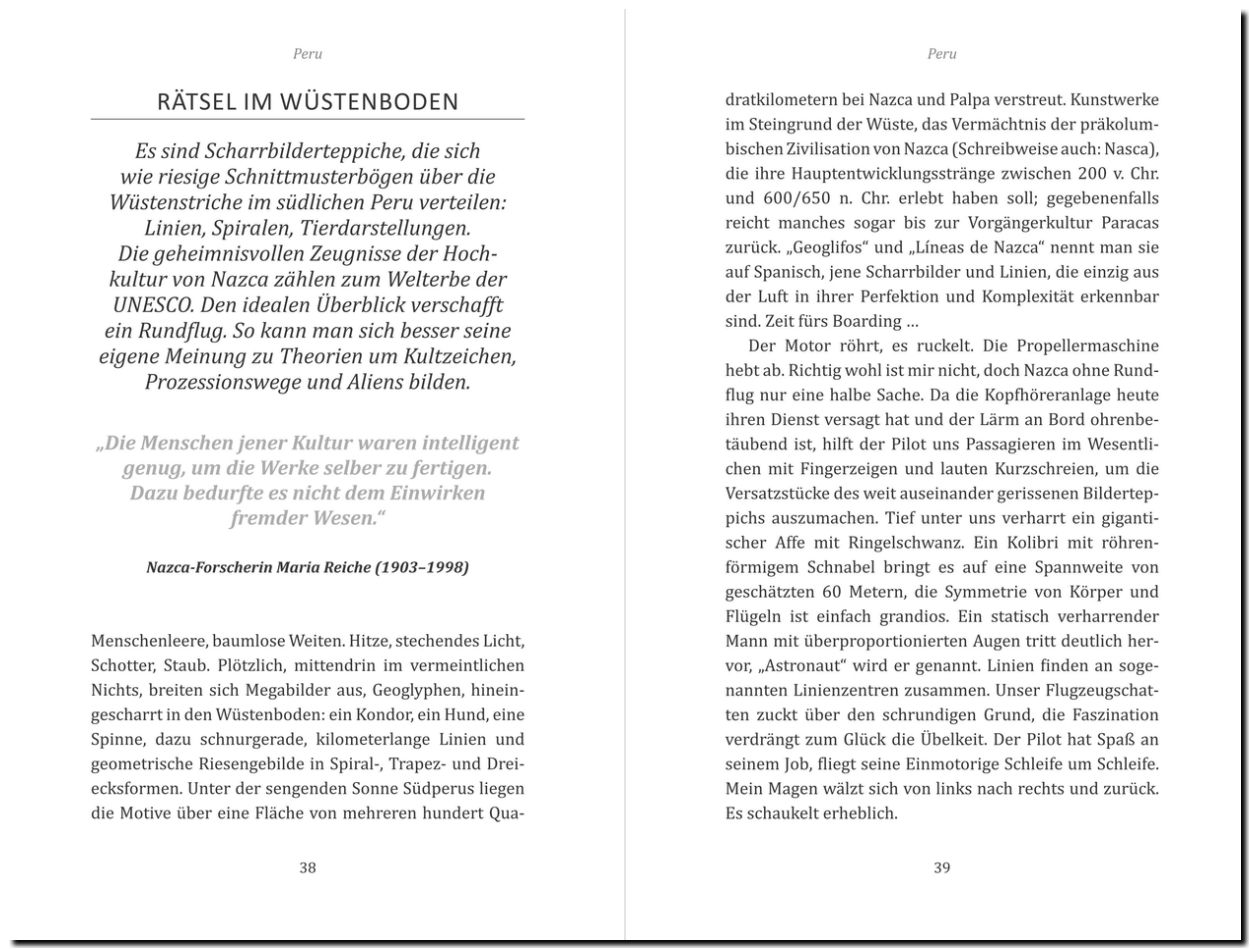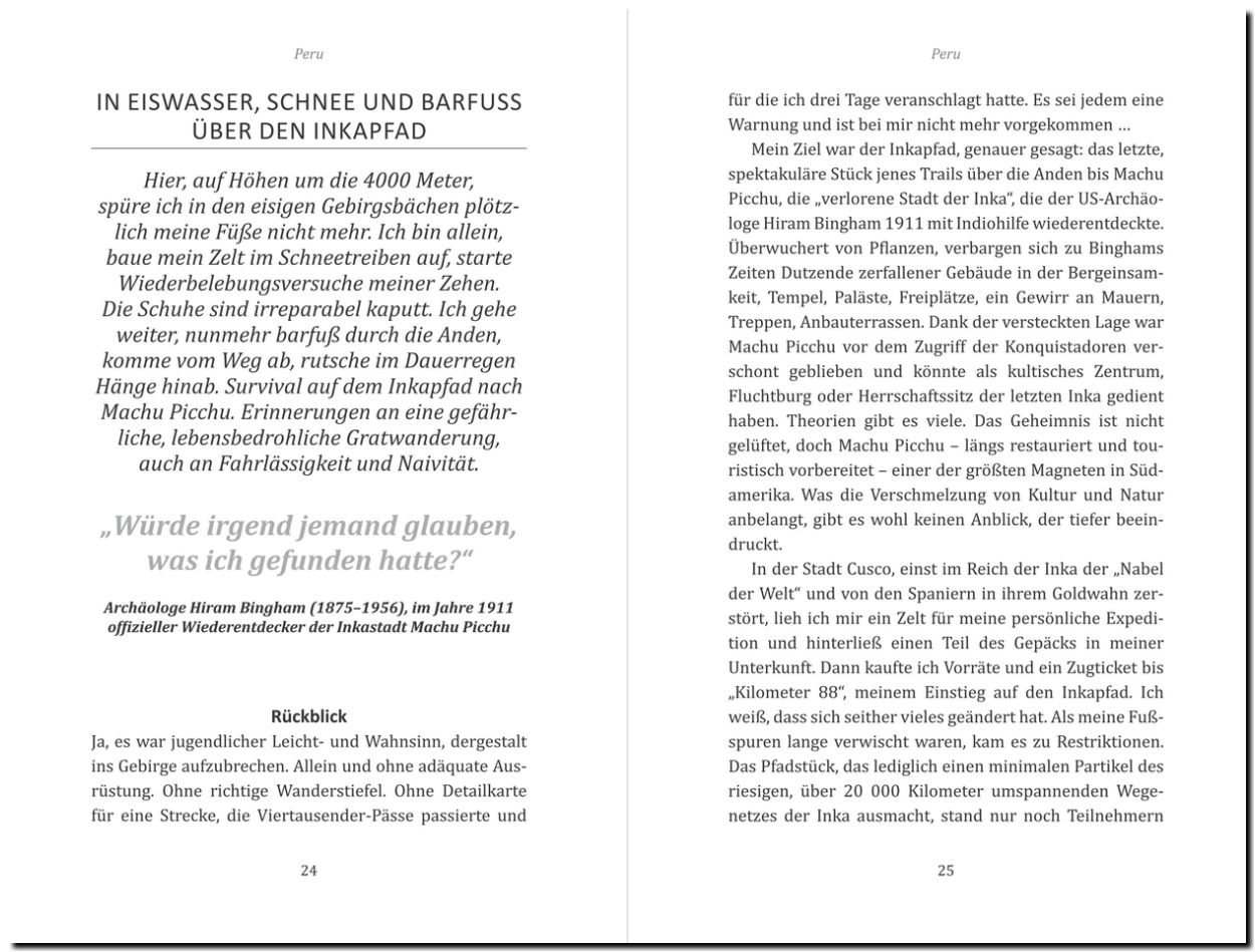 "REISE & PREISE-Autor Andreas Drouve lässt seine Leser an persönlichen Erfahrungen und Begegnungen teilhaben. Ob beim Barfußtrip im Schnee (!) auf dem Inkapfad oder bei einem Sturm auf dem Titicacasee. Die kurzen Geschichten fangen die besondere Atmosphäre der Orte ein. ein ausgesprochenes Lesevergnügen!!"