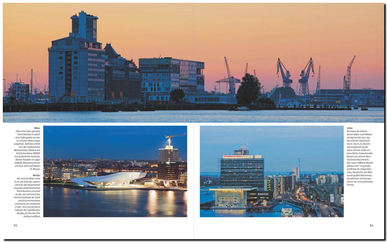 Kulturliebhaber pilgern zum Museumplein, an dem mit dem prachtvoll restaurierten Rijksmuseum, dem Van Gogh- und dem Stedelijk Museum gleich drei „erste Adressen“ zu finden sind. Das nahegelegene historische Concertgebouw ist bekannt für seine fantastische Akustik. Freunde zeitgenössischer Musik zieht es ins Muziekgebouw aan ’t IJ. Der spektakuläre Glaspalast ist eine der neuen Landmarken, mit denen die Stadt in den letzten Jahren ihrer Wasserseite neue Glanzlichter aufsetzte.