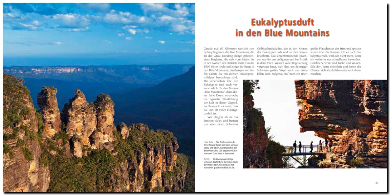 Das Rot der endlosen Weiten, in denen man sich leicht verlieren kann. Das Grün der dichten Regenwälder, deren urtümlichen Baumriesen mit ihren Kronen ein magisches Licht erzeugen. Das Blau des Meeres, das spektakuläre Riffsysteme beherbergt und paradiesische Inseln umspült. Die pulsierenden, schillernden Großstädte oder doch die verschlafenen Outback-Nester. Eine Tierwelt, die zum größten Teil nur dort so vorkommt und mit vielen Besonderheiten aufwartet. All das werden wir auf dieser bebilderten Reise gemeinsam entdecken und erleben.