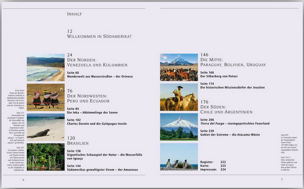 "Der Bildband „Südamerika“ von den Fotografen Christan Heeb und Karl-Heinz Raach sowie dem Autor Andreas Drouve zeigt auf beeindruckende Weise die Schönheit und die Vielfältigkeit des Kontinents. Die herrlichen Bilder des Titicacasees, des Zuckerhuts von Rio de Janeiro oder der Zeugnisse der verschiedensten Hochkulturen wecken beim Leser den Wunsch, sofort nach Südamerika aufzubrechen. [...] Bilder vom Karneval in Rio dürfen natürlich in dem prächtigen Bildband über Südamerika nicht fehlen. [...] Phantastisch ist auch die Aufnahme des Tals des Mondes, das sich als Mosaik aus bizarren Felsformationen und roten Canyonwänden zeigt. Atemberaubend schön ist auch das touristische Highlight im Südwesten Argentiniens, das Seengebiet um San Carlos de Bariloche."