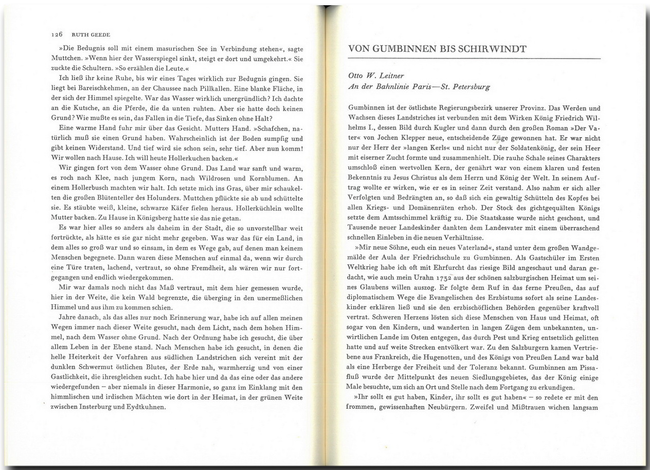 Autoren: Martin A. Borrmann, Hans Lucke, Grete Fischer, Paul Brock, Ernst Mollenhauer, Walter Gernhöfer, Ida Kunigk, Gertrud Papendick, Hans-Ulrich-Stamm, Erwin Friedrich Kaffke, Ruth Geede, Otto W. Leitner, Hans Graf von Lehndorff, Joachim Piechowski, Walther Grosse, Botho von Berg, Georg Mielcarczyk, Alfred Liedigk, Georg Hermanowski, Ottfried Graf Finckenstein, Paul Fechter, Herbert Kirrinnis, Hansgeorg Buchholtz, Rudolf Grentz, Siegfried Lenz, Erhard Riemann, Carl von Lorck, Markus Joachim Tidick.