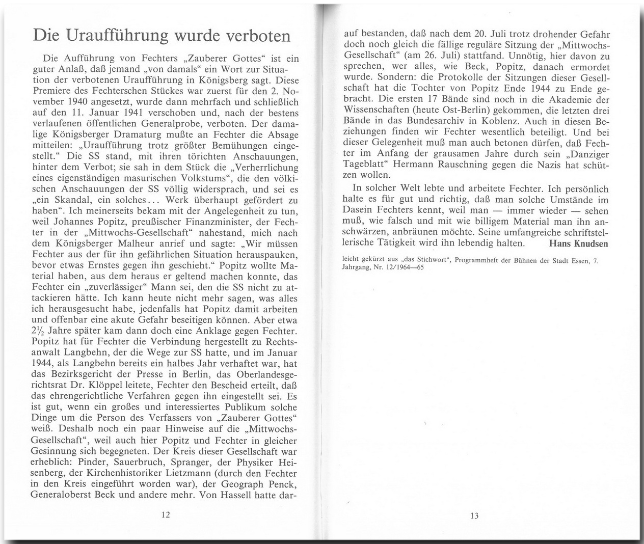 In seiner ersten von sieben in dem Jahrzehnt zwischen 1938 und 1948 entstandenen Komödien "Der Zauberer Gottes" beschreibt Paul Fechter das Leben des einstigen volkstümlichen Pfarrers Michael Pogorzelski. Es ist allerdings keine einfache historische Biographie, sondern ein Werk freier dichterischer Gestaltung, in der er seine Vorstellung eines Zauberers als Flucht aus der bedrückenden Realität verwirklicht.