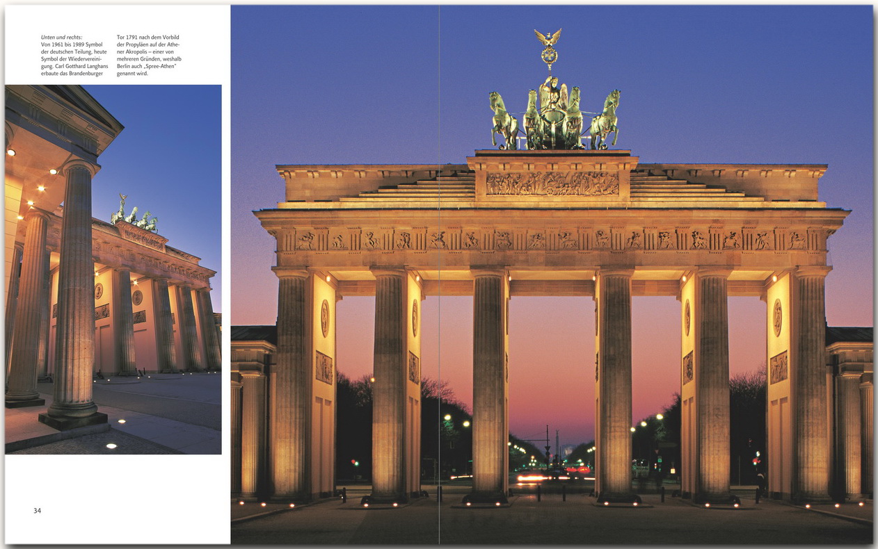 In der Hauptstadt und Weltstadt prallen Gestern, Heute und Morgen so unmittelbar aufeinander wie an kaum einem anderen Ort. Bauten wie das Brandenburger Tor oder der Reichstag erzählen von der Vergangenheit, angesichts der modernen Hochbauten am Potsdamer Platz fühlt man sich in die Zukunft versetzt, in Szenekneipen und einer vielfältigen Kulturlandschaft genießt man das Hier und Jetzt.