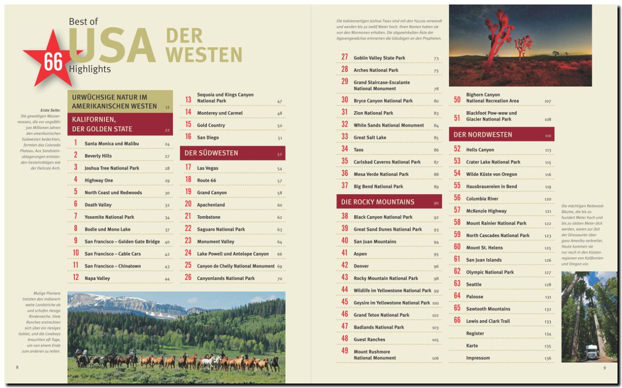 „Best of USA – Der Westen“ stellt die 66 lohnenswertesten Reiseziele aus diesem Teil Amerikas vor. Neben Hollywood, dem Yellowstone National Park und dem Grand Canyon findet sich auch Sehenswertes abseits der typischen Ziele in diesem Band.