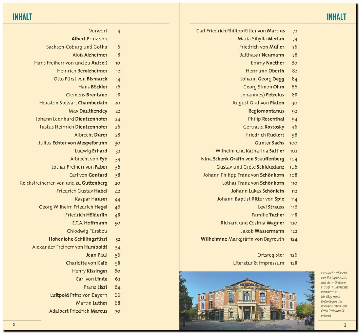 - 60 Kurzbiografien von Prinz Albert von Sachsen-Coburg-Gotha über Kaspar Hauser und Friedrich Rückert bis zu Markgräfin Wilhelmine von Bayreuth- Aktuelle Farbbilder der einstigen Wohn- und Wirkungsstätten- Übersichtskarten und Ortsregister für Spurensucher